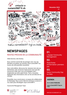 Sous la direction de l'Office fédéral de la statistique (OFS) et de l'Administration numérique suisse (ANS), la plateforme swissdatacommUNITY vise à soutenir les comités et les groupes d'experts actifs dans des domaines tels que les statistiques, la gestion des données, les données de l'Open Government et la science des données, afin de présenter des activités, d'établir des réseaux et de se développer.